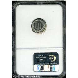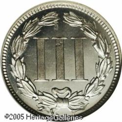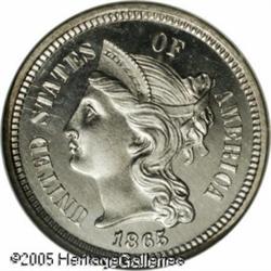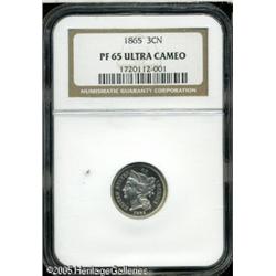 <B>1865 3CN PR65 Deep Cameo NGC.</B></I> The exceptional white on black contrast provides imposing eye appeal. A brilliant Gem that is flawless aside from a small spot in the upper reverse field. The first year Three Cent Nickel has a pattern opposite that of the later years in the series: the business strikes are high mintage and common, while the proofs are rarely encountered, especially with Deep Cameo contrast. The date is repunched west with a wide spread. Population: 5 in 65 Deep Cameo, 3 finer (1/05).<BR><I>From The Mike Jacobson Collection.</B></I> Lot:5717