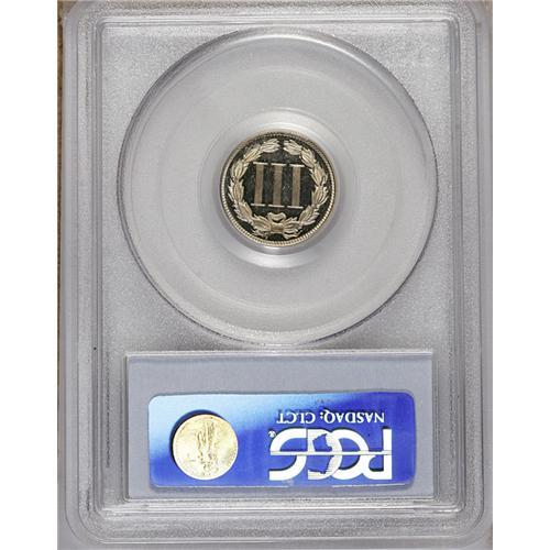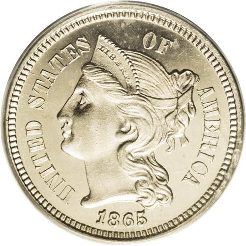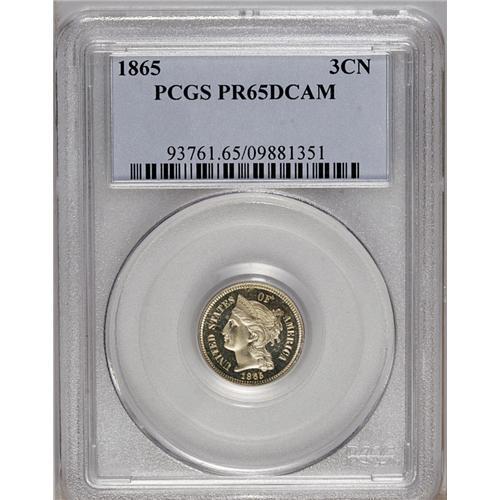 <B>1865<3CN> PR65 Deep Cameo PCGS.</B></I> The 1865 proof three cent nickel, with an estimated mintage of about 500 or so pieces, is one of the keys to the proof series, along with the 1877 proof-only. Fewer than 300 examples have been certified by PCGS and NGC combined, with less than 80 of these carrying the Cameo designation. The design elements on this specimen are razor-sharp, except for a touch of minor softness on the middle lines of the first pillar of the III. Speckles of light milky-like color occur in the fields. A few barely noticeable ticks are seen on each side, but do not distract in the least. Population: 2 in 65 Cameo, 7 finer (7/06). <BR><BR><B>Important notice:</