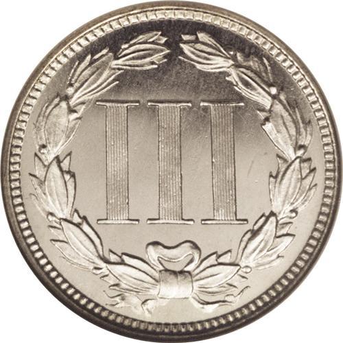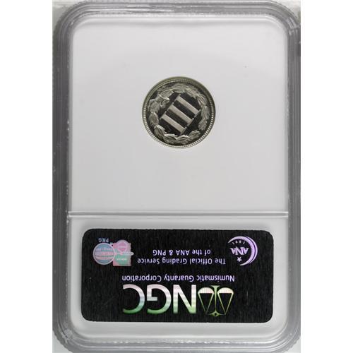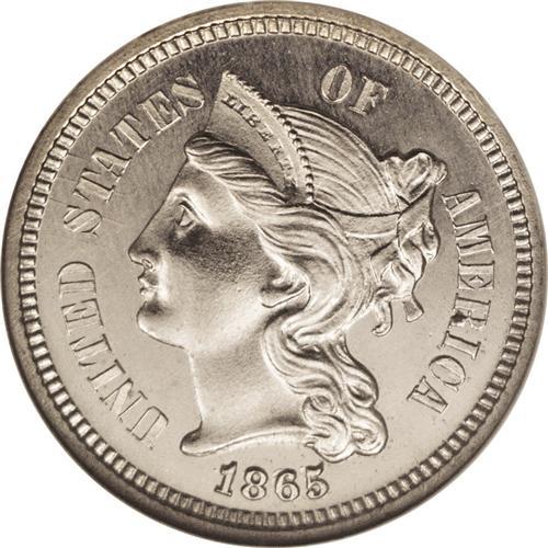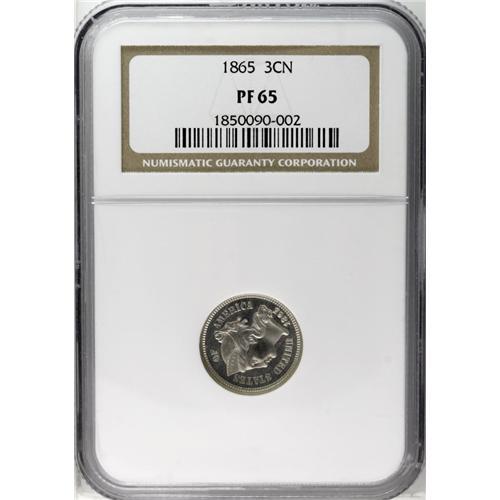 <B>1865<3CN> PR65 NGC.</B></I> First year of issue, being most common in Uncirculated and most difficult to find as a proof. Hazy gray toning over moderately reflective fields that show numerous mint-made die striations. One of an estimated proof mintage of 500 pieces.