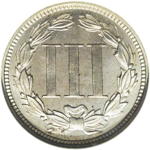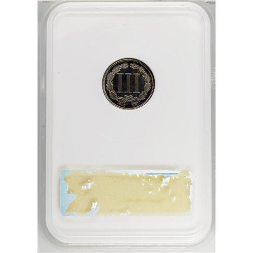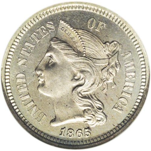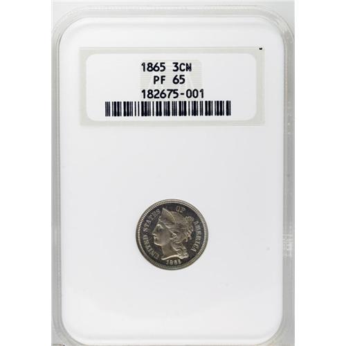<B>1865 3CN PR65 NGC.</B></I> The 1865 three cent nickel has a scant mintage of 500 pieces. This Gem example displays light golden-gray surfaces that portray a cameo-like effect when the coin is rotated beneath a light source. The design features are well impressed, and nary a mark is visible on either side. A small planchet defect is noted beneath the ED of UNITED. Census: 59 in 65, 15 finer (10/06).<BR><BR><b>Shipping:</b> Coin/Currency (<a target="_blank" href="http://www.heritageauctions.com/common/shipping.php">view shipping information</a>)