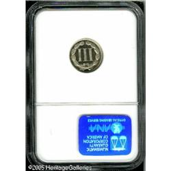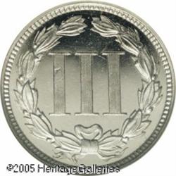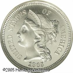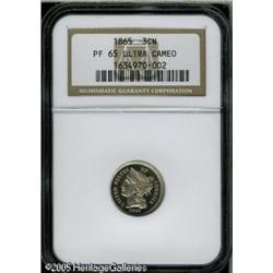 <B>1865 3CN PR65 Ultra Cameo NGC.</B></I> Unfathomably deep mirrors are seen on each side, providing a black background against the frosted white devices. Rarely is such a profound cameo effect seen on an 1865. Such amazing black-and-white cameo contrast is seldom seen on any Proof Three Cent Nickel. This is also the key-date among Proof Three Cent Nickel coinage, with a reported mintage of 500 coins, although the actual production is not specifically known. Population: 5 in 65, 3 finer (1/05). Lot:5776