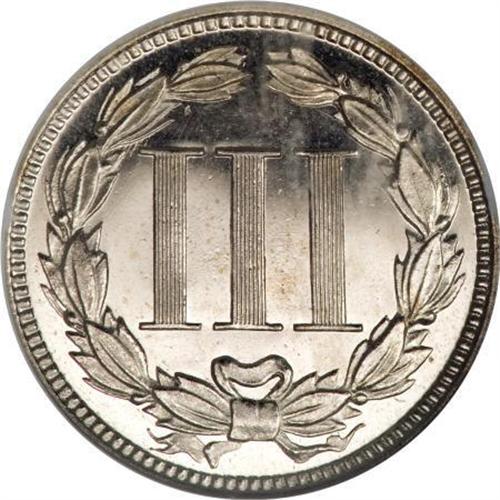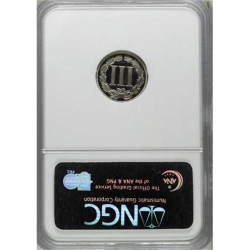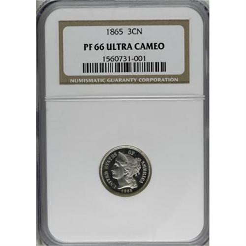 <B>1865 3CN PR66 Ultra Cameo NGC.</B></I> With only 500 or so pieces minted, the 1865 proof is one of two key dates in the three cent nickel series, along with the 1877 which has a similar mintage. Few high grade proofs were preserved from this year, and even fewer coins are known with the stark cameo contrast seen on this piece. Essentially brilliant, there is just the faintest accent of golden color present over the denticles on the obverse. Census: 6 in 66 Ultra Cameo, 2 finer (6/07).<BR><BR><b>Shipping:</b> Coins & Currency (<a target="_blank" href="http://www.heritageauctions.com/common/shipping.php">view shipping information</a>\)