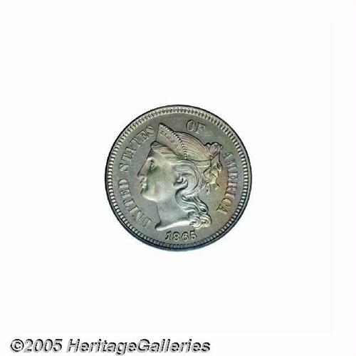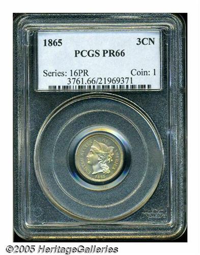 1865 3CN PR66 PCGS. Doubled Date. Breen 2412, the