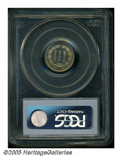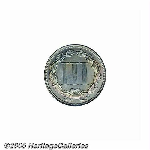 <B>1865<3CN> PR66 PCGS.</B></I> Doubled Date. Breen 2412, the first punching far to the left of the final position. According to Breen, "over 90 percent of proofs of this date are from these dies." The first year 1865 is the most difficult of all Three Cent Nickels as a proof, and is infrequently located as Gem. This magnificent specimen advances to even loftier levels, being irregularly framed in multicolored, rainbow patina. We note two unobtrusive specks of carbon on the obverse, one above Liberty's head and another just behind her hair bun. Population: 17 in 66, none finer (6/05).
