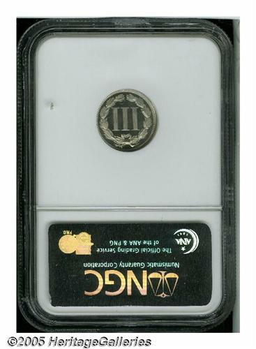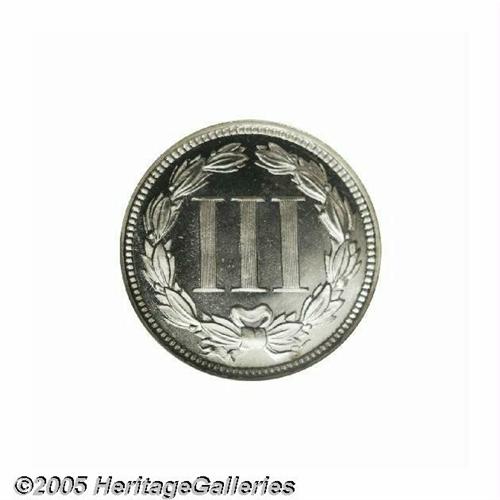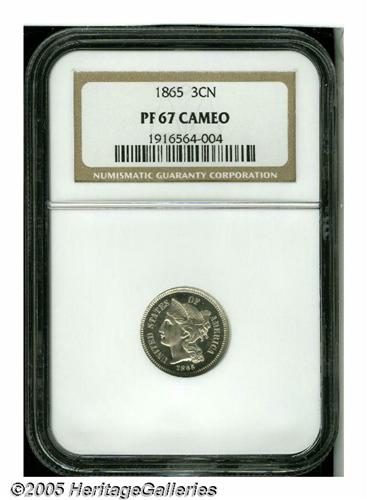 <B>1865<3CN> PR67 Cameo NGC.</B></I> One of the flashier and best preserved examples of this first year issue we have encountered, this exemplary specimen is virtually untoned and immediately greets the viewer with solid cameo contrast. A wispy vertical blemish at the center of Liberty's cheek may have resulted from the minting process. Population: 1 in 67 Cameo (1 also in 67 Cameo <S), 0 finer (6/05).