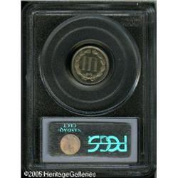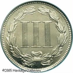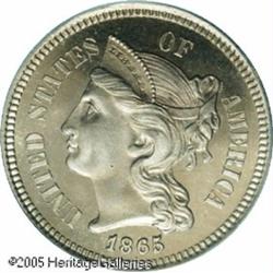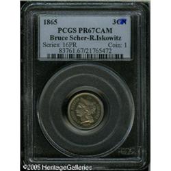 <B>1865 3CN  PR67 Cameo PCGS.</B></I> All four digits in the date are repunched, with the initial, largely effaced logotype located west of the prominent date. Essentially presenting as untoned, gentle pastel-gold hues enrich this meticulously struck Gem. Both sides exhibit a noticeable cameo contrast amid unusually reflective fields. The reverse is essentially immaculate, while the obverse device shows a microscopic planchet imperfection at the lower portion of Liberty's jaw. This is only mentioned for future identification purposes. The first year 1865 Three Cent Nickel is the most difficult proof issue in the series, although the proof-only 1877 is more rare as a date. This is the single finest example graded at PCGS, NGC has also seen one Proof 67 Cameo (1/05).<BR><I>From the Bruce Scher #1 All-Time PCGS Registry Set.</B></I>   Lot:4025