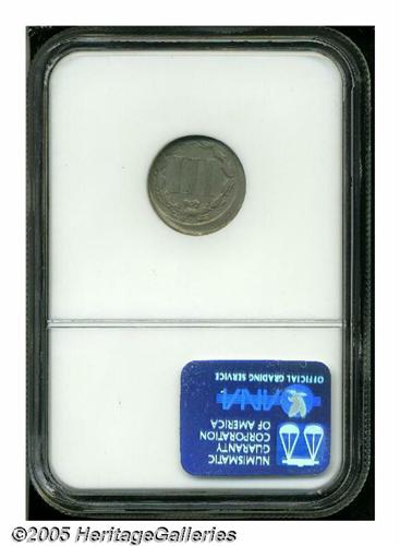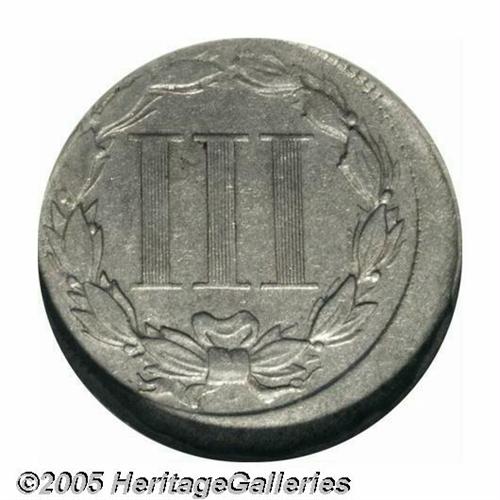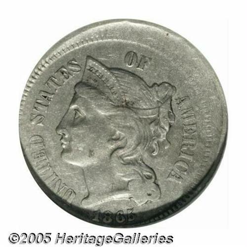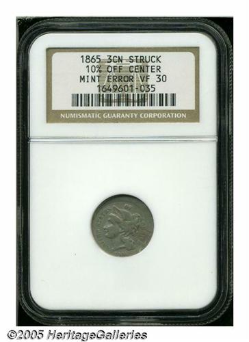 <B>1865<3CN> Three Cent Nickel--10% Off Center--VF30 NGC.</B></I> Struck with extra flan on the northeast portion of the obverse and corresponding southeast portion of the reverse. This piece apparently spent several years in circulation before anyone thought it was worth three cents to set it aside. A planchet flaw is noted on the jawline of Liberty, otherwise light gray surfaces.<BR><I>From The Western Hills Collection.</B></I>