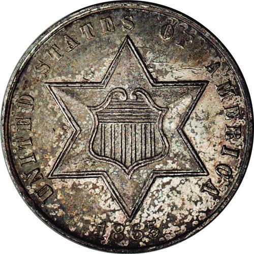 <B>1865<3CS>--Environmental Damage--NCS. Unc Details.</B></I> Struck from lightly clashed dies. Most design features are sharp and the fields are reflective, a combination that would lead many numismatists to classify the presently offered piece as a proof; indeed, the distinction between proofs and prooflike business strikes is frequently more of an art than a science, and numismatic experts can often disagree when it comes to borderline cases. Envelope included.