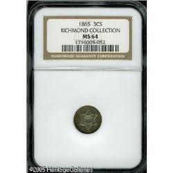 <B>1865 3CS MS64 NGC.</B></I> Ex: Richmond Collection. Aqua, apple-green, and orange patina rolls over each side of this exquisitely struck specimen. This piece generates considerable eye appeal. Lot:5665