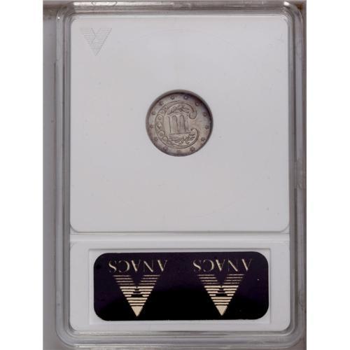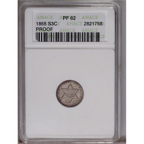 <B>1865<3CS> PR62 ANACS.</B></I> Noticeable die clashing is seen on both the obverse and reverse. Medium steel-gray toning is accented with multicolored iridescence at selected border areas.