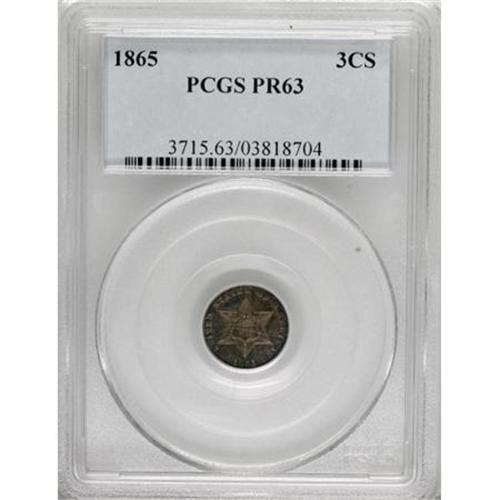 <B>1865 3CS PR63 PCGS.</B></I> Gold, rose, and olive toning envelop this decisively struck and unabraded specimen. Only 500 proofs and 8,000 business strikes were issued for this scarce Civil War date.<BR><BR><b>Shipping:</b> Coins & Currency (<a target="_blank" href="http://www.heritageauctions.com/common/shipping.php">view shipping information</a>)