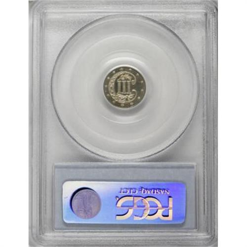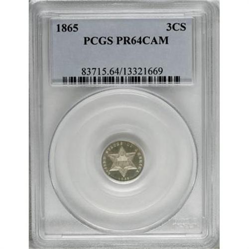 <B>1865 3CS PR64 Cameo PCGS.</B></I> A sumptuous Civil War-era proof trime that offers eye-popping contrast and eye appeal. Delicate champagne and sky-blue shadings visit the watery fields, which show a handful of faint hairlines. Population: 4 in 64 Cameo, 6 finer (12/07).<BR><BR><b>Shipping:</b> Coins & Currency (<a target="_blank" href="http://www.heritageauctions.com/common/shipping.php">view shipping information</a>)