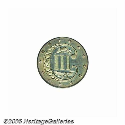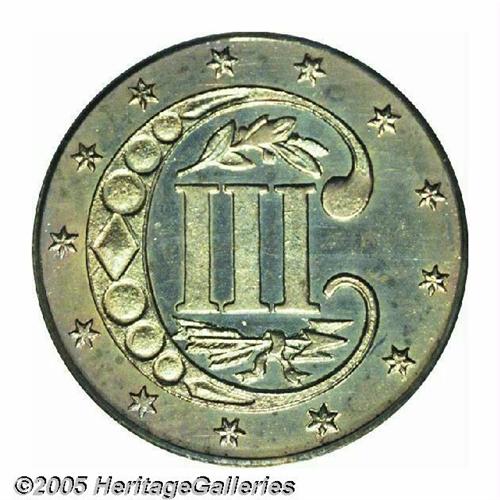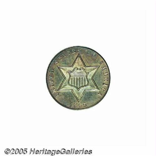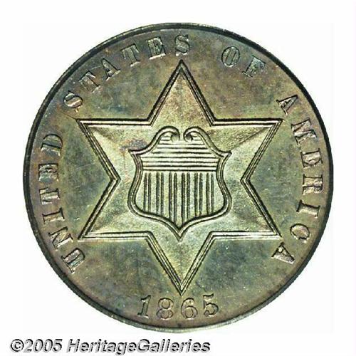 <B>1865<3CS> PR65 PCGS.</B></I> Bright devices shine through interesting, original toning in blue-green and purple-lilac shades on this attractive Gem example. The design elements are sharply struck; only the middle reverse leaf is not fully brought up. The surfaces are exquisitely preserved, displaying no significant marks of any kind. Seldom seen as a business strike, the proofs of this date are also a challenge with only 500 pieces originally produced.<BR><I>From The Melrose Bay Collection.</B></I>