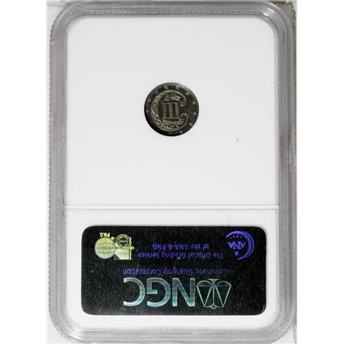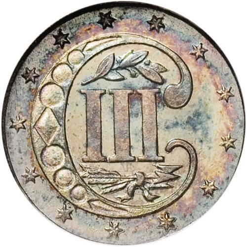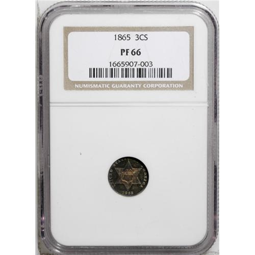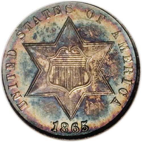 <B>1865<3CS> PR66 NGC.</B></I> All of the design features are sharply struck and the glassy, reflective surfaces are richly toned in variegated hues of electric-blue, rose, and gold. Seldom seen as a business strike, the proofs of this date are also a challenge with only 500 pieces originally produced. Census: 18 in 66, 9 finer (8/06).