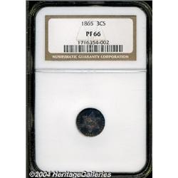 <B>1865<3CS> PR66 NGC.</B></I> Vivid mauve, electric-blue, and peach colors enrich this flashy and exquisitely struck premium Gem. A mere 500 proofs were issued, along with 8,000 business strikes. Population: 15 in 66, 10 finer (9/04). <BR><BR><B>Important notice:</B> Heritage usually auctions material at the rate of 200-250 lots per hour. On some occasions eBay Live bid software or the Internet may not be able to keep up with the pace of the auction. We recommend placing a realistic absentee bid now as insurance to avoid disappointment. Occasionally the auctioneer may eliminate or reject an eBay Live bid, and the auctioneer may also reopen a lot after the close of the eBay live bidding (usually because we missed an audience bid), and may reject your bid even if it shows you as the winning bidder. By bidding via eBay Live, you agree that Heritage may award the lot to another bidder at its sole discretion under the circumstances described above or any other reasonable circumstances. Since eBay bids are not shown to us until we open the lot on the floor, we treat those bids just like floor bids. In most cases the floor responds before the eBay bid is presented to us, due to Internet lag time, so for consistency we have made it a policy that floor bids are always considered first over tie eBay live bids. Also please note that all Heritage lots purchased through eBay Live carry a 20% Buyer's Premium. Please make sure you read the Terms and Conditions before you bid.