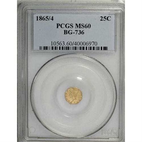 <B>1865/4 25C Liberty Octagonal 25 Cents, BG-736, Low R.6, MS60 PCGS.</B></I> . PCGS Population (1/12). NGC Census: (0/1). (#10563)<BR><BR><b>Shipping:</b> Coins & Currency (<a target="_blank" href="http://www.heritageauctions.com/common/shipping.php">view shipping information</a>)