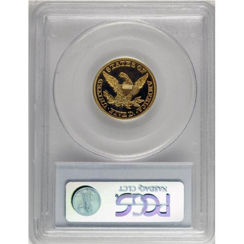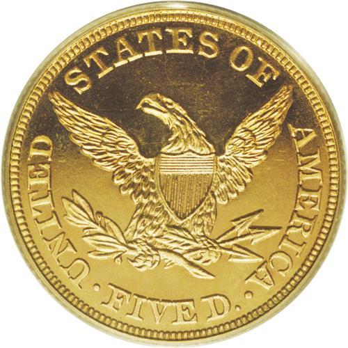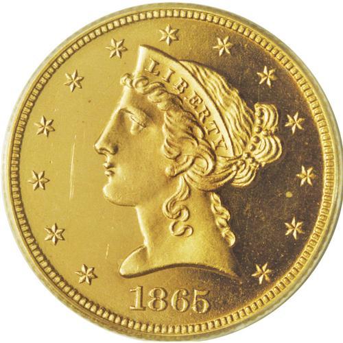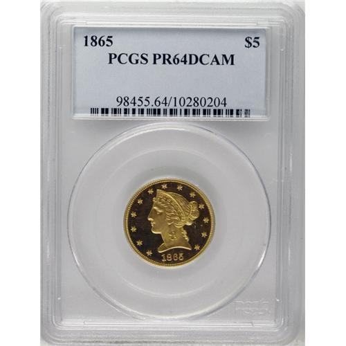 <B>1865 $5 PR64 Deep Cameo PCGS.</B></I> Production of 1865 proof half eagles dropped from an average of more than 50 pieces over the preceding six years to a miniscule 25 pieces in 1865. Of that already tiny number, only 12-14 specimens are believed to survive. Over the past decade, the most noteworthy example to appear on the market was the PCGS PR66 from the Harry W. Bass Collection which was sold in November, 2000 for $66,700. The demand for proofs from this year is further enhanced by the difficulty of 1865 business strikes, of which a mere 1,270 pieces were produced.<BR> The desirable proof 1865 five dollar offered here is a dramatically-contrasted specimen whose fields offer illimitable depth of mirrored reflectivity that provide stark contrast against the needle sharp devices. Both sides are coated in a beautiful orange-gold patina that in no way undermines the strong reflective qualities. Close inspection of the obverse reveals a long, paper-thin facial blemish that curves down from Liberty's nose to her jawline. A couple of glancing disturbances are found on the reverse. One is noted in the field above the eagle's head and the second is an almost imperceptible pinscratch that begins beneath the first T in STATES and continues to the juncture of the eagle's left (facing) wing. A significant find for the specialist in early proof gold. Population: 3 in 64 Deep Cameo, 0 finer (12/06).<BR><BR><b>Shipping:</b> Coin/Currency (<a target="_blank" href="http://www.heritageauctions.com/common/shipping.php">view shipping information</a>)