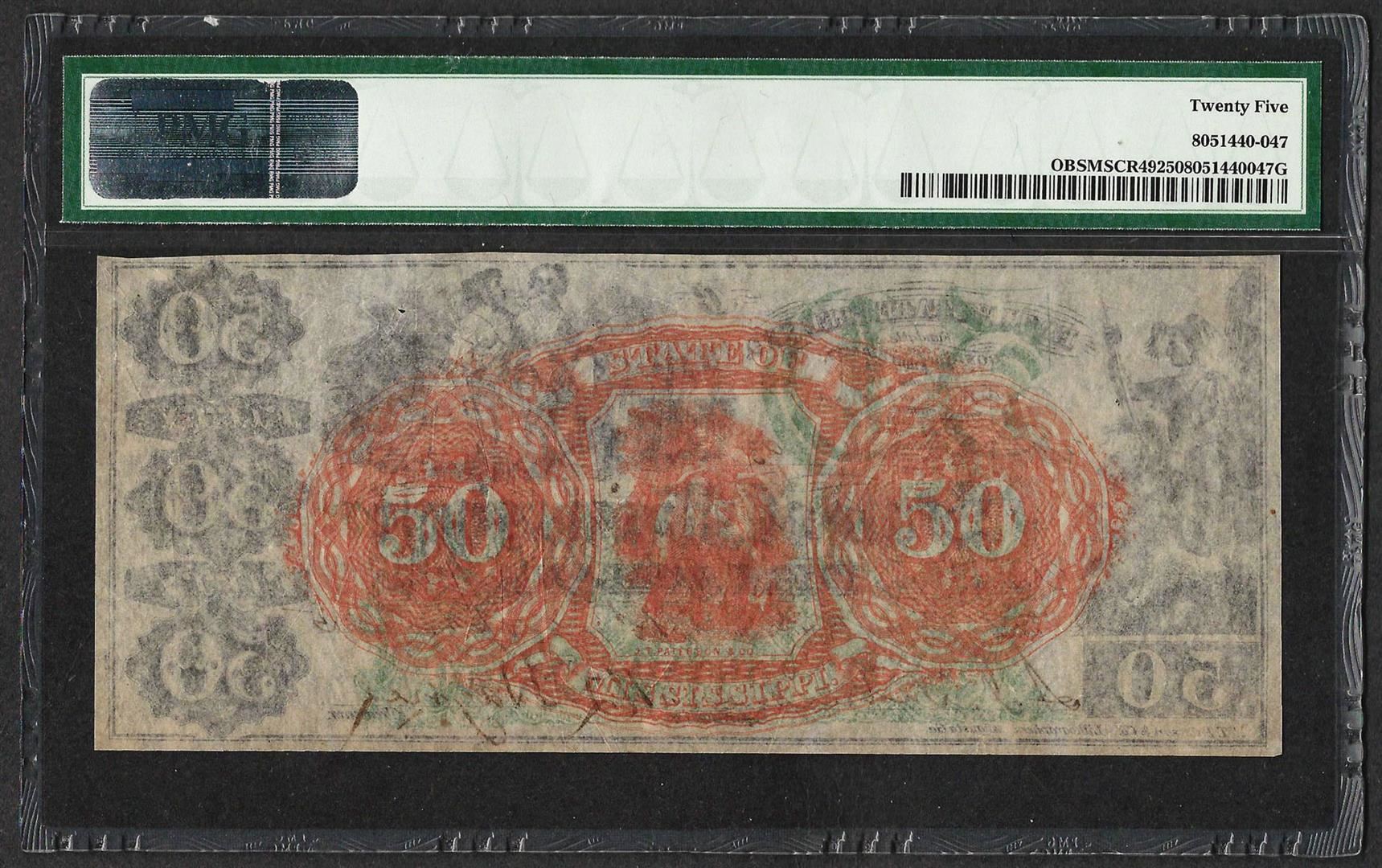 One 1865 $50 State of Mississippi Obsolete Banknote PMG Very Fine 25. PMG Certified.