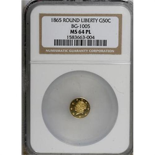 <B>1865 50C Liberty Round 50 Cents, BG-1005, Low R.5, MS64 Prooflike NGC.</B></I> Flashy mirrored fields contrast with radiant devices. The upper borders of the portrait and a few central reverse letters are incompletely brought up, but inspection fails to reveal marks or hairlines. The (8/07) NGC Census shows only a single example graded, an AU58.<BR><BR><b>Shipping:</b> Coins & Currency (<a target="_blank" href="http://www.heritageauctions.com/common/shipping.php">view shipping information</a>)