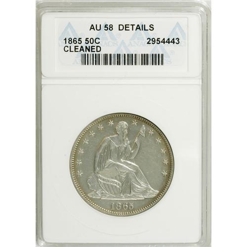 <B>1865 50C --Cleaned--ANACS. AU58 Details.</B></I> NGC Census: (4/32). PCGS Population (5/28). Mintage: 511,400. Numismedia Wsl. Price: $333. (#6313)<BR><BR><b>Shipping:</b> Coins & Currency (<a target="_blank" href="http://www.heritageauctions.com/common/shipping.php">view shipping information</a>)