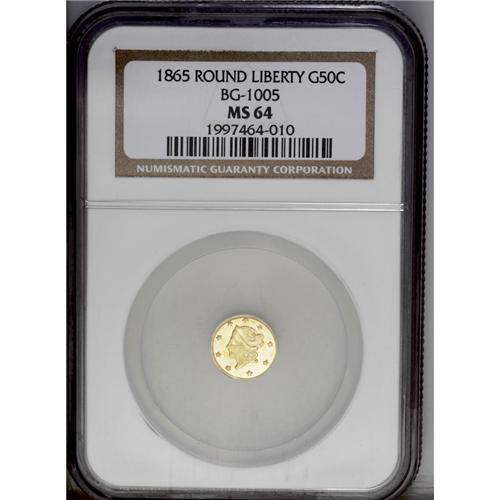 <B>1865<50C> Liberty Round 50 Cents, BG-1005, Low R.5, MS64 NGC.</B></I> Choice and rare, especially in grades this high. The simple devices are well struck, and a die crack is noted at the upper right of the reflective, yellow-gold obverse.