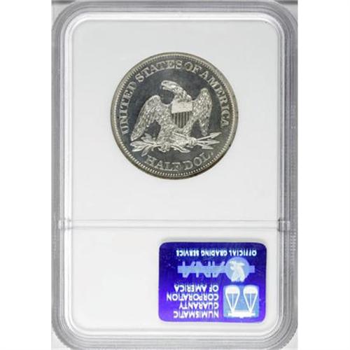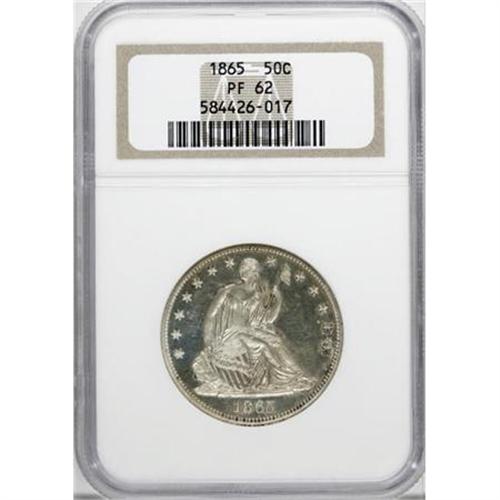 <B>1865 50C PR62 NGC.</B></I> Delicate silver-green and champagne toning graces much of this Civil War-era proof, though the last two stars show more opaque beige patina. Boldly impressed with flashy, albeit moderately hairlined fields.<BR><BR><B>Coin Engraver:</B> Christian Gobrecht<BR><BR><b>Shipping:</b> Coins & Currency (<a target="_blank" href="http://www.heritageauctions.com/common/shipping.php">view shipping information</a>)