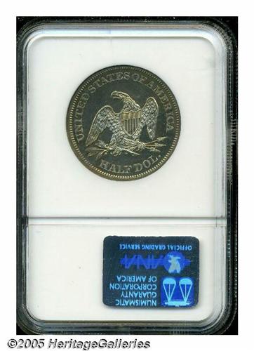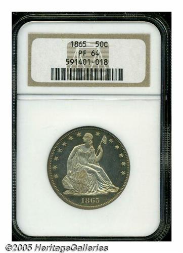 <B>1865<50C> PR64 NGC.</B></I> Typically sharply struck with watery fields and lovely satin-frosted devices. Attractively, originally toned, free of contact marks, and showing wispy hairlines in the fields that seemingly prevent a higher grade. Population: 46 in 64, 37 finer (4/05).