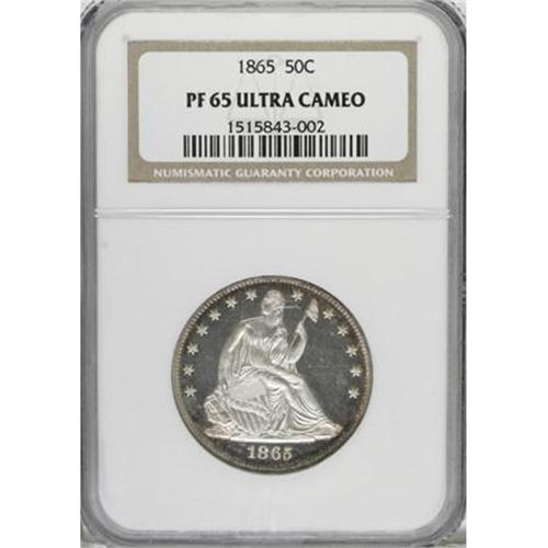 <B>1865 50C PR65 Ultra Cameo NGC.</B></I> The devices and legends are thickly frosted, and provide outstanding contrast with the mirrored fields. The strike is penetratingly precise, and light peripheral obverse golden-russet toning contributes further to the eye appeal. A mere 500 proofs were struck. Census: 1 in 65 Ultra Cameo, 1 finer (11/07).<BR><BR><b>Shipping:</b> Coins & Currency (<a target="_blank" href="http://www.heritageauctions.com/common/shipping.php">view shipping information</a>)