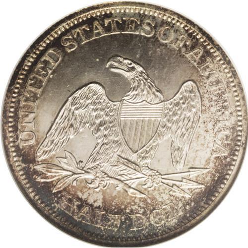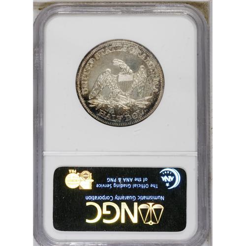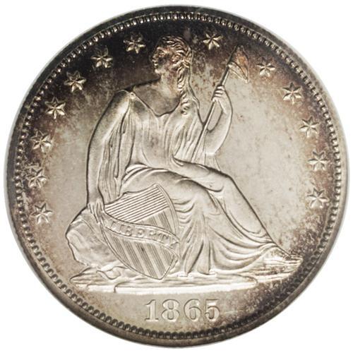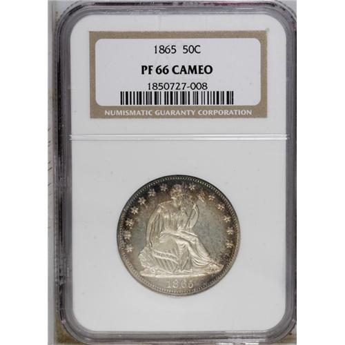 <B>1865 50C PR66 Cameo NGC.</B></I> Notable as the final year of the No Motto design, an even 500 proofs were produced but only a handful have survived in such a superior state of preservation. The fields are deeply mirrored and flashy with noticeably frosted devices. As one would expect from a proof, the devices show intricate definition in all areas, including the edges of the denticles and the eagle's claws. Most of each side remains brilliant with deeper autumn-brown and navy-blue toning around the margins. Census: 8 in 66, 2 finer (9/06).<BR><BR><b>Shipping:</b> Coin/Currency (<a target="_blank" href="http://www.heritageauctions.com/common/shipping.php">view shipping information</a>)