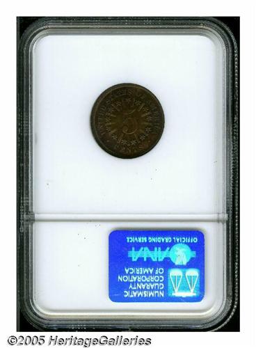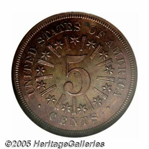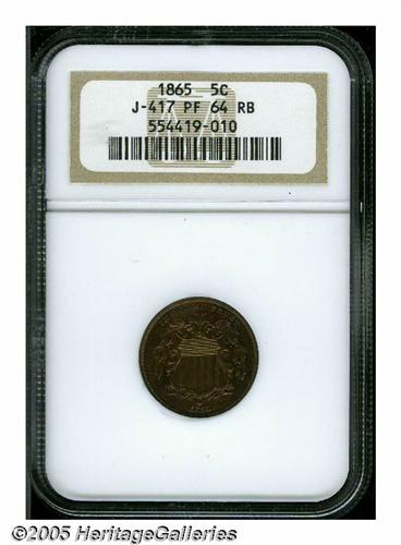 <B>1865<5C> Shield Five Cents, Judd-417, Pollock-489, R.7, PR64 Red and Brown NGC.</B></I> A true prototype issue for the Shield nickel, struck from the same dies as the proofs of 1866 with plain center dot. Struck in copper with a plain edge. A colorful coating of rose-violet and mint-green iridescent toning accompanies nicely mirrored surfaces.<BR><I>From The Western Hills Collection.</B></I>