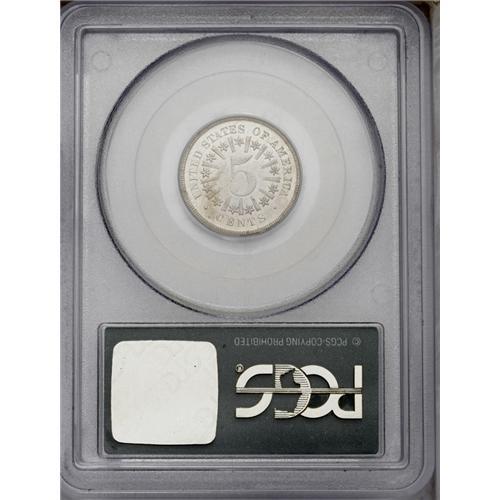 <B>1865<5C> Shield Nickel, Judd-416, Pollock-488, High R.6, PR64 PCGS.</B></I> A transitional pattern with the designs of the 1866 Rays Shield nickel issued for circulation, but dated 1865. In the same category of patterns as the widely collected 1856 Flying Eagle cent, but not as well known. Struck in nickel with a plain edge. Delicately toned pale gold and powder-blue, with minor striking weakness in the centers. Housed in a green label holder. Population: 8 in 64, 1 finer (3/06).