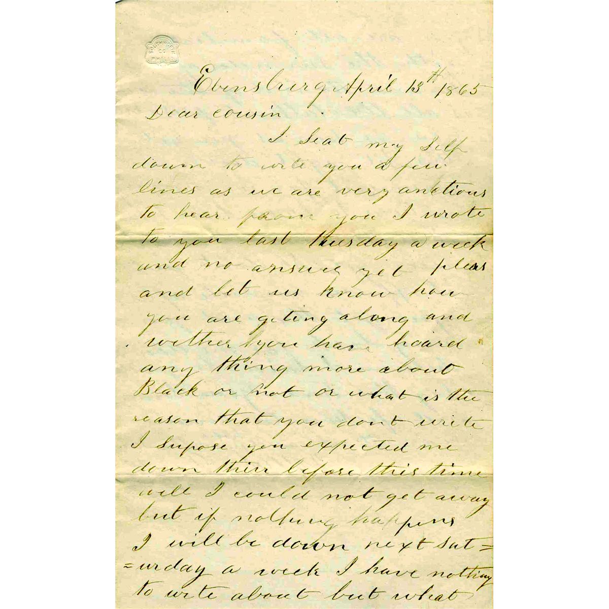 Letter, datelined ''Ebensburg, April 13th 1865,'' concerning the location of Lt. John Black, 12th PA Cavalry, Company G. Sent by Black's cousin William Leighty, a veteran of the 85th PA Infantry, Company C, to Black's wife Jennie in Loudon County, VA. Reads in part, ''Dear Cousin…let us know…whether you have heard anything more about Black or not…I suppose you expected me down there before this time. Well, I could not get away but if nothing happens, I will be down next Saturday a week. I have nothing to write about but what you are all familiar with the surrender of Lee and the end of the war. Now as soon as you get this, sit right down and answer it for we are very anxious to know how John is. Whether he is dead or alive yet. So don't put it off one minute after you get this and you may look for me down the time I said…'' Sepia letter, which runs 2pp., measures 5'' x 8'' and has a small fold at top of letter's spine, otherwise a clear, legible letter in excellent condition.