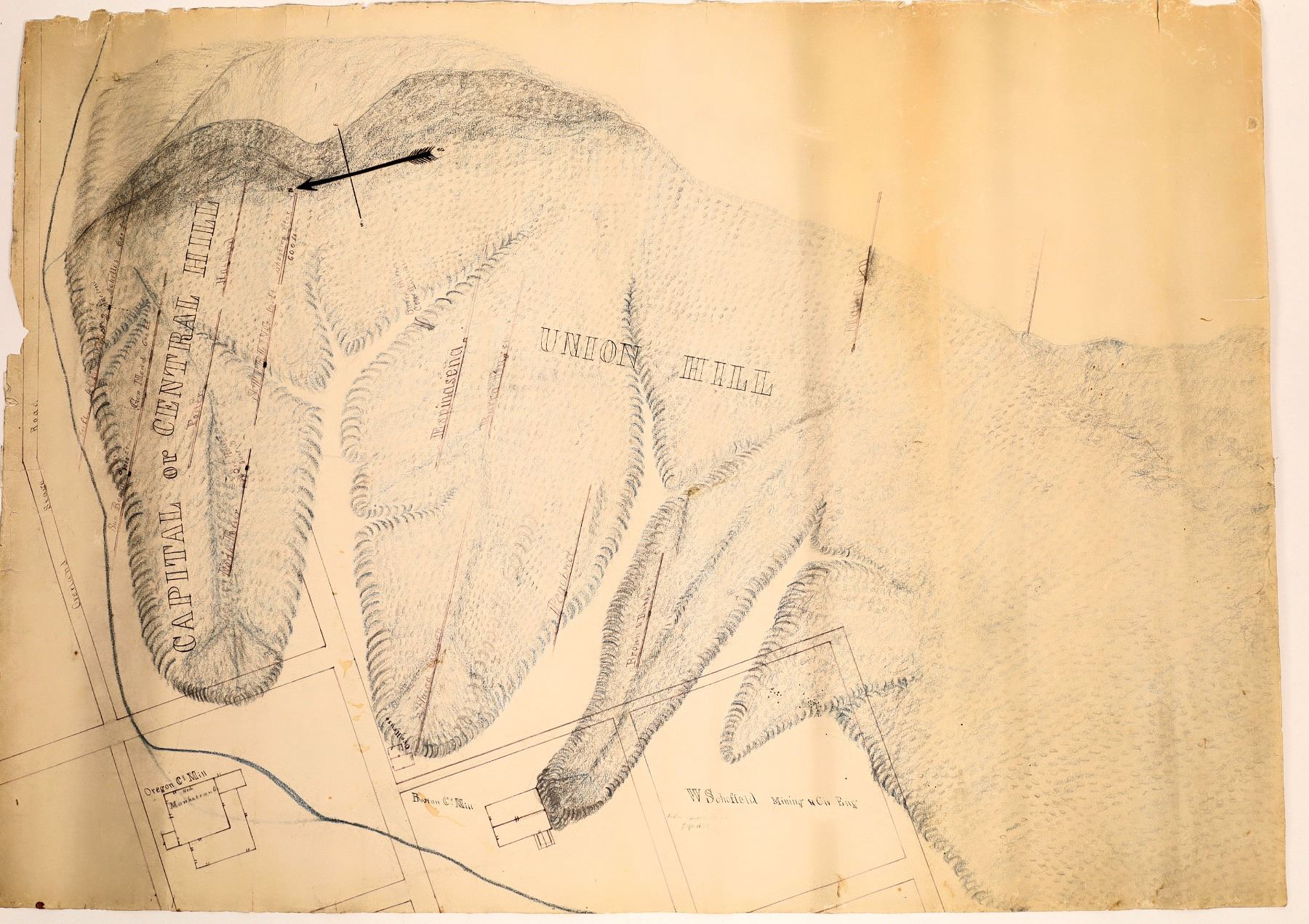 22.5 x 31" hand drawn and colored map of mining properties on Union and Central Hill drawn by W, Schofield, mining and civil engineer, dated Austin, Lander Co., Nevada, Sept. 1865. This is a remarkable and previously unpublished map showing the relative locations of the following lodes from waht may be the very beginning of the discovery period in 1863: (from south to north) Brown & Butler; Penobscot; Naiad Queen; Burra Burra; Espinasena; North River; Sterling Co.; Achilles; and a few more. The mills of the Boston Co. and the Oregon Co are shown, along with the Overland Trail at the left edge of the map, north of all else shown. The ore house for the Naiad Queen is also shown. A pencil note was added later on the Oregon Mill, "now Manhattan Co.".