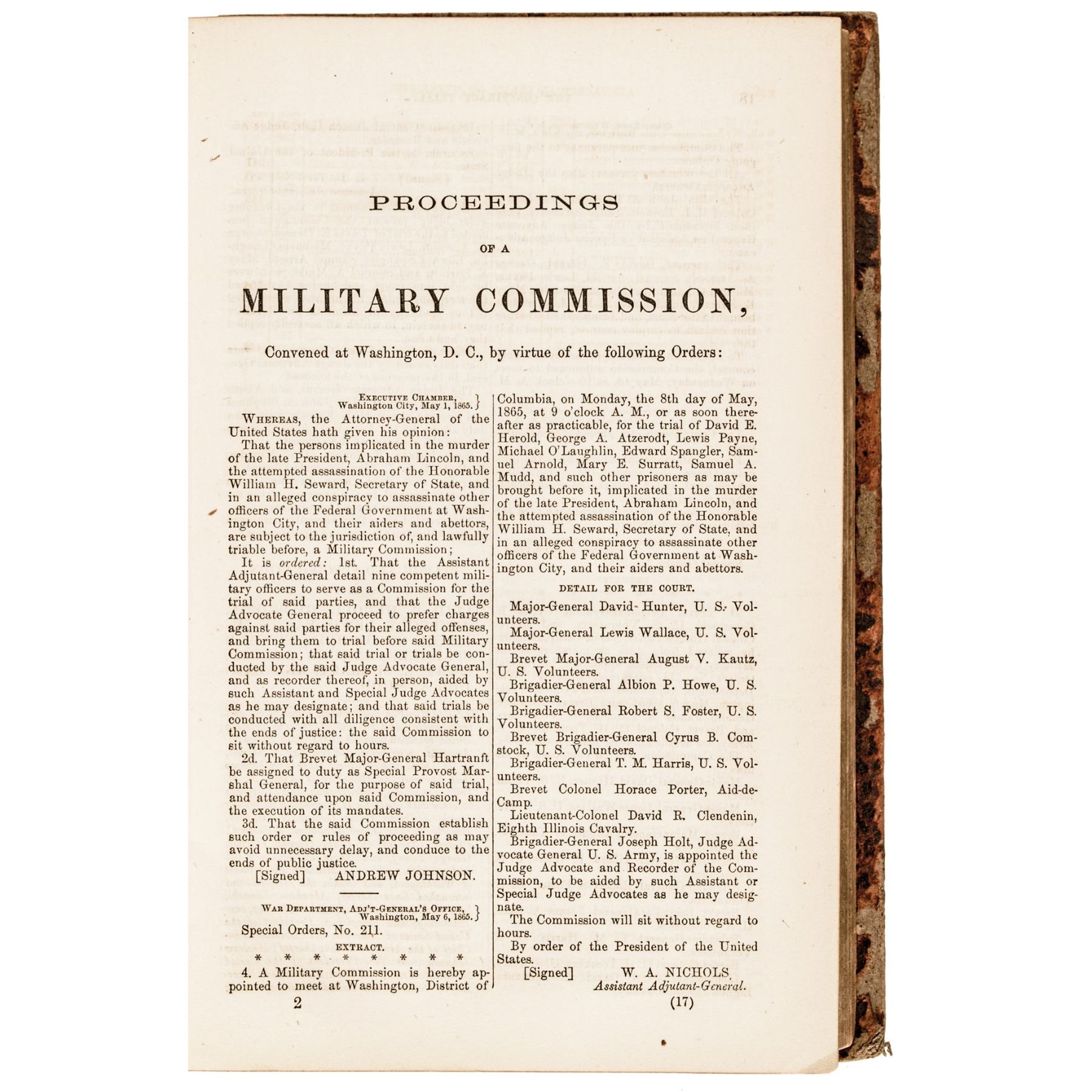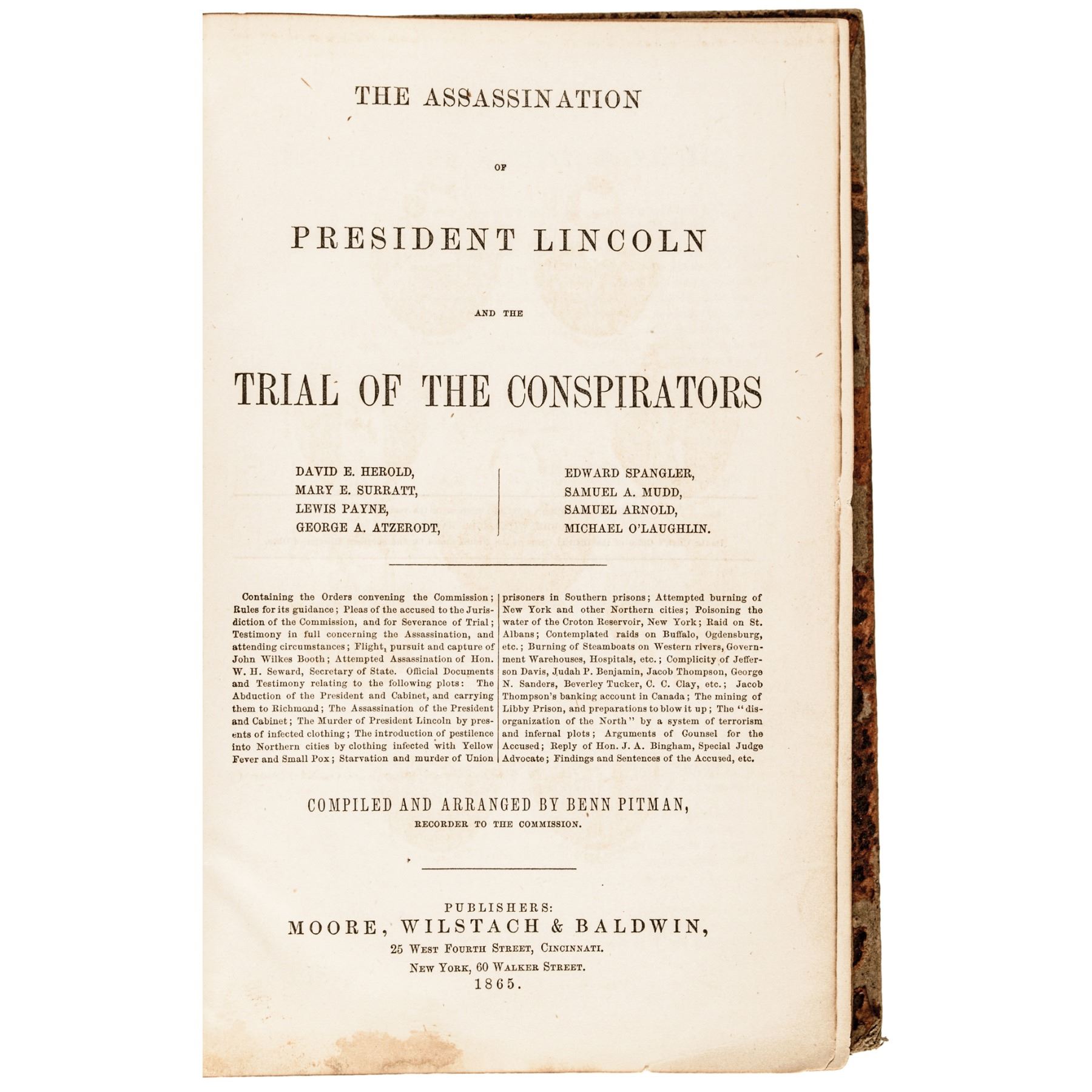 Important period Book titled “The Assassination of President Lincoln and the Trial of the Conspirators,” compiled by Benn Pitman, Recorder to the Commission, 421 pages, 9.75” x 6.5”, hardcover. Excellent historic Frontispiece engraving by A. H. Ritchie showing portraits of the conspirators, protected by the original tissue sheet. Bound in the original leather board with a plain spine. Shows wear from use on the outside and some of the front and end papers are in rough condition, yet all of the pages of the text are clean with only very light foxing here and there. This pivotal work was the First Complete Account of the Investigation and proceedings. A rare publication with great content for Lincoln related library specialists.