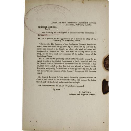 <B>Confederate General Orders Naming Lee General In Chief,</B></I> Signed in print by Samuel Cooper, one page, 5" x 7.5", Richmond, February 6, 1865. Section 1 of this rare imprint states that "<I>The Congress of the Confederate States of America do enact, That there shall be appointed by the President, by and with the advice and consent of the Senate, an officer, who shall be known and designated as 'General in Chief,' who shall be ranking officer of the army, and as such, shall have command of the military forces of the Confederate States</B></I>". Robert E. Lee is named to the position in Part II of the Orders. This document carries the handstamp of the U.S. War Department's Rebel Archive. Two burn spots in right margin, light overall browning, else very good condition.<BR><BR><b>Shipping:</b> Small Collectibles (<a target="_blank" href="http://www.heritageauctions.com/common/shipping.php">view shipping information</a>)