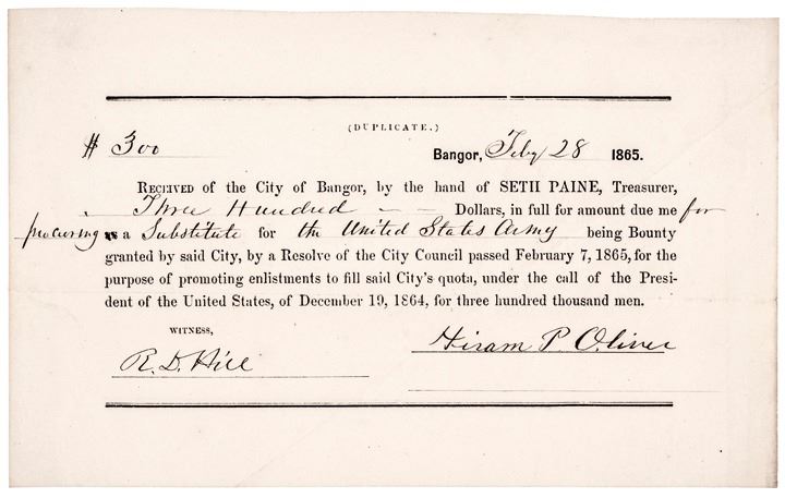 “Received of the City of Bangor, by the hand of Seth Paine, Treasurer, Three Hundred Dollars in full for amount due me for procuring a Substitute for the United States Army being Bounty granted by said city, by a Resolve of the City Council passed February 7, 1865, for the purpose of promoting enlistments to fill said City’s quota, under the call of the President of the United States, of December 19, 1864, for three hundred thousand men.”