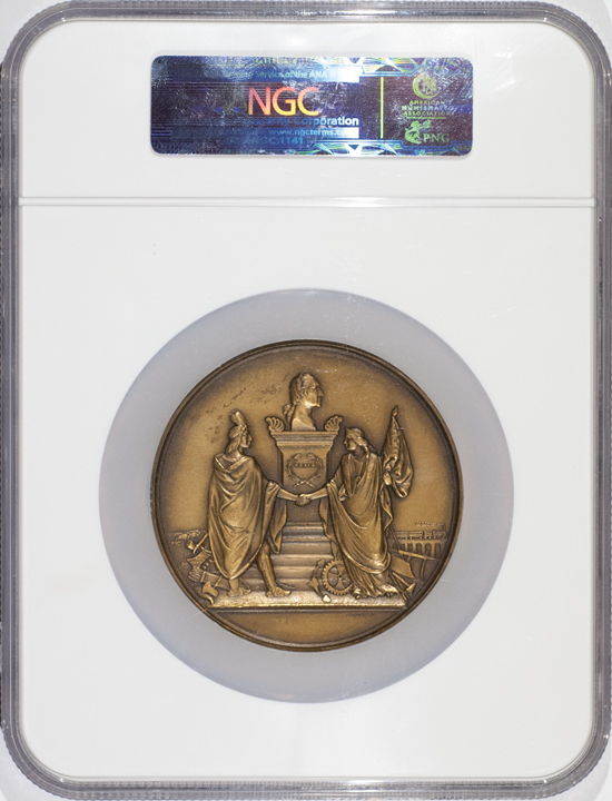 Julian IP-40. 76 mm. This is a truly beautiful superb quality specimen. This medal, dated 1865, was struck at the Mint about 1900 (not noted on its NGC Insert) using the new reverse design. This is an impressive, medal that features the new reverse Engraved by Anthony Pacquet and struck at the United States Mint. This reverse of this medal was originally to have been made for Abraham Lincoln’s second term medal, but when Lincoln was assassinated, the mint decided to use the reverse anyway on Johnson’s medal. The reverse features many American icons, including abust of George Washington on a pedestal, a steam engine, plow, herd of buffalo, etc. The color is a rich, even natural “Yellow Bronze” in color. This medal is handsomely housed in its special, 7.25” x 5.75” custom NGC Certification display holder.