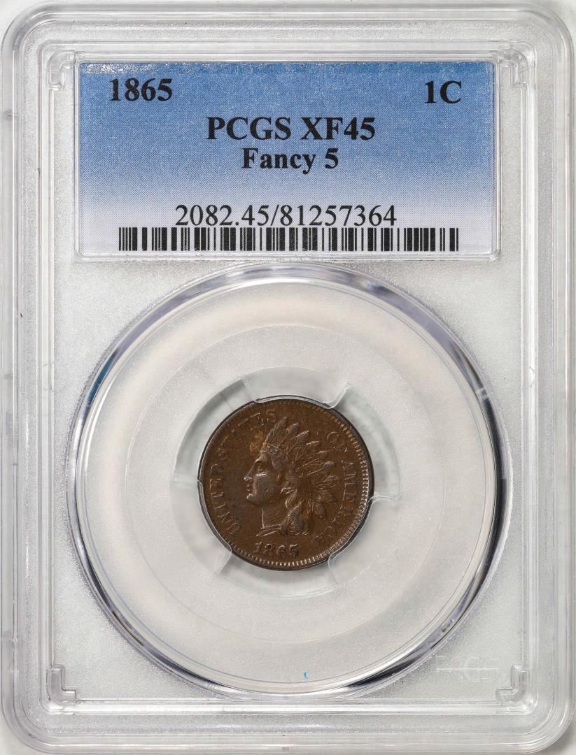 One 1865 Fancy 5 Indian Head Cent Coin PCGS XF45. PCGS Graded.