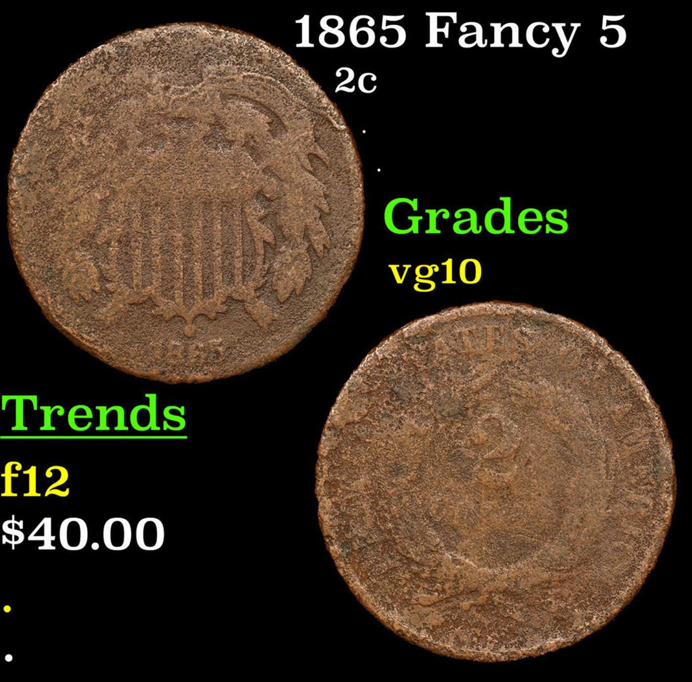 1865 Fancy 5 Two Cent Piece 2c Grades vg+