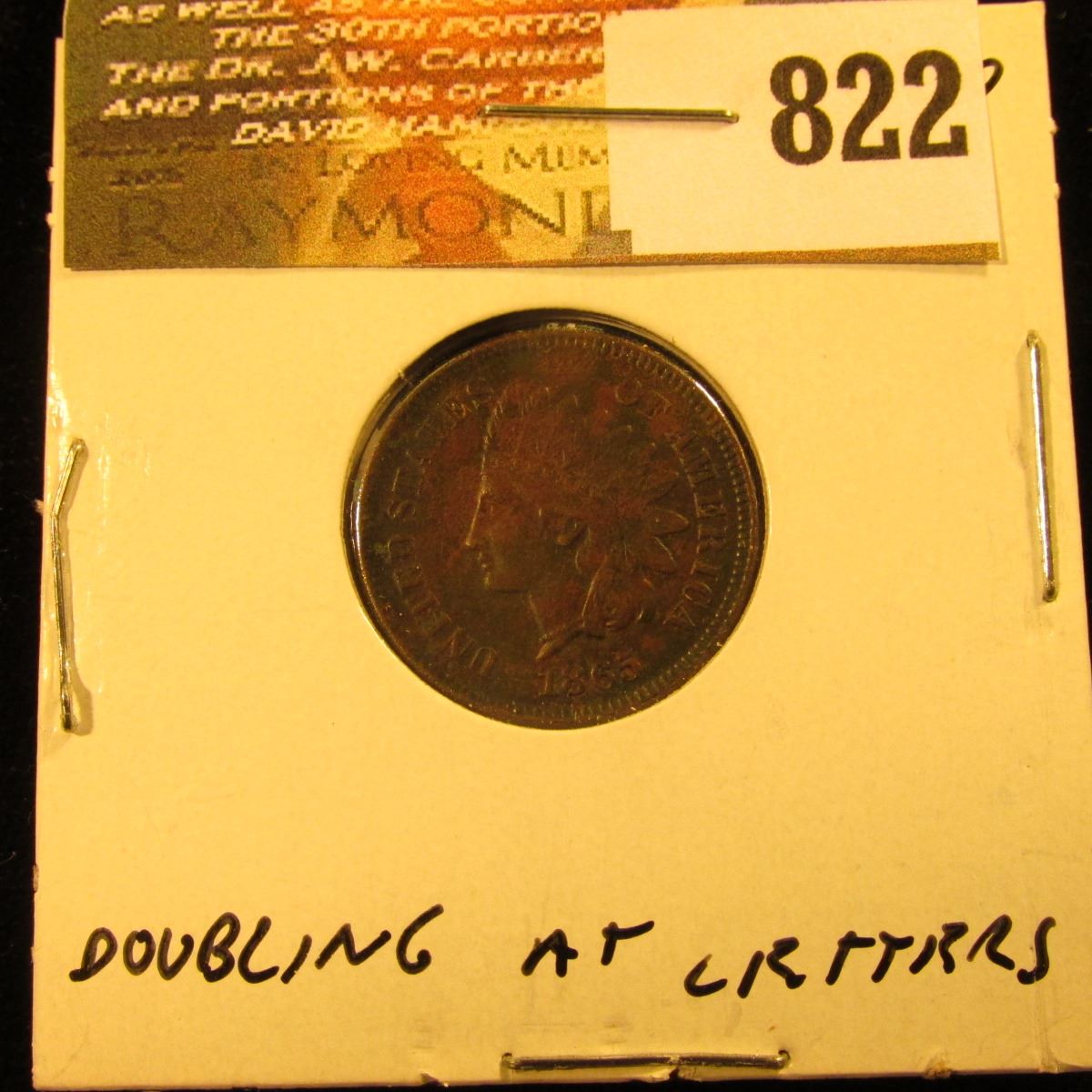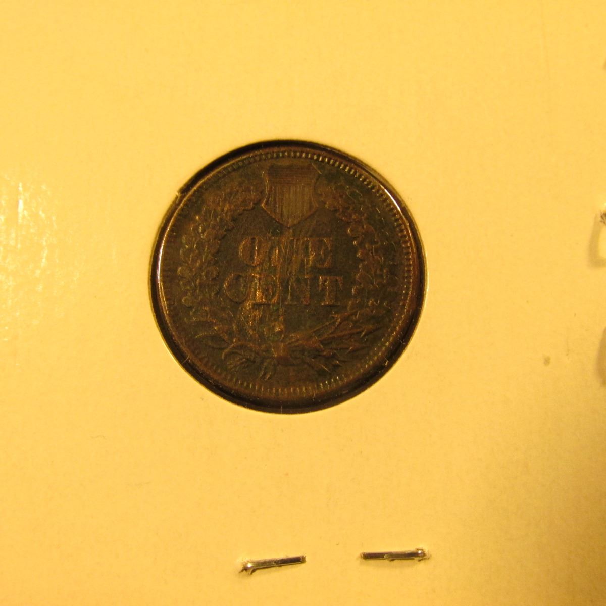 1865 Fancy Five Indian Head Cent. Slightly porous with hub doubling, EF.