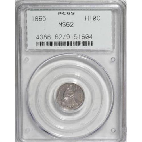 <B>1865 H10C MS62 PCGS.</B></I> Excellent definition and soft, pleasing luster are the prime attributes of this faintly toned half dime, primarily silver-blue with a splash of rose in the right obverse field. Wispy abrasions on each side account for the grade. Housed in a prior-generation PCGS holder. Population: 9 in 62, 33 finer (1/08).<BR><I>From The Al Blythe Collection of Half Dimes.</B></I><BR><BR><B>Coin Engraver:</B> Christian Gobrecht<BR><BR><b>Shipping:</b> Coins & Currency (<a target="_blank" href="http://www.heritageauctions.com/common/shipping.php">view shipping information</a>)