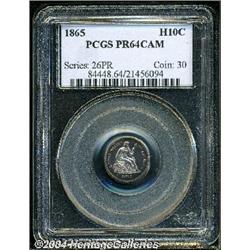 <B>1865<H10C> PR64 Cameo PCGS.</B></I> The devices are sharply contrasted against the reflective fields. A thin veneer of pale purple toning adheres to the obverse, while the reverse is nearly untoned, save for lighter shades of purple at the rims. A minute mark is apparent just beneath Liberty's right breast, and another above the left knee. Population: 5 in 64, 6 finer (9/04). <BR><BR><B>Important notice:</B> Heritage usually auctions material at the rate of 200-250 lots per hour. On some occasions eBay Live bid software or the Internet may not be able to keep up with the pace of the auction. We recommend placing a realistic absentee bid now as insurance to avoid disappointment. Occasionally the auctioneer may eliminate or reject an eBay Live bid, and the auctioneer may also reopen a lot after the close of the eBay live bidding (usually because we missed an audience bid), and may reject your bid even if it shows you as the winning bidder. By bidding via eBay Live, you agree that Heritage may award the lot to another bidder at its sole discretion under the circumstances described above or any other reasonable circumstances. Since eBay bids are not shown to us until we open the lot on the floor, we treat those bids just like floor bids. In most cases the floor responds before the eBay bid is presented to us, due to Internet lag time, so for consistency we have made it a policy that floor bids are always considered first over tie eBay live bids. Also please note that all Heritage lots purchased through eBay Live carry a 20% Buyer's Premium. Please make sure you read the Terms and Conditions before you bid.