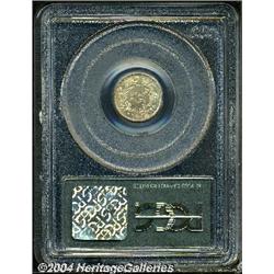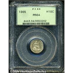 <B>1865<H10C> PR64 PCGS.</B></I> Light gold surfaces present a cameo-like appearance on this beautiful near-Gem. Wispy fine hairlines in the fields, and a dark toning spot on the lower reverse near the rim, limit the grade. Population: 51 in 64, 27 finer (9/04). <BR><BR><B>Important notice:</B> Heritage usually auctions material at the rate of 200-250 lots per hour. On some occasions eBay Live bid software or the Internet may not be able to keep up with the pace of the auction. We recommend placing a realistic absentee bid now as insurance to avoid disappointment. Occasionally the auctioneer may eliminate or reject an eBay Live bid, and the auctioneer may also reopen a lot after the close of the eBay live bidding (usually because we missed an audience bid), and may reject your bid even if it shows you as the winning bidder. By bidding via eBay Live, you agree that Heritage may award the lot to another bidder at its sole discretion under the circumstances described above or any other reasonable circumstances. Since eBay bids are not shown to us until we open the lot on the floor, we treat those bids just like floor bids. In most cases the floor responds before the eBay bid is presented to us, due to Internet lag time, so for consistency we have made it a policy that floor bids are always considered first over tie eBay live bids. Also please note that all Heritage lots purchased through eBay Live carry a 20% Buyer's Premium. Please make sure you read the Terms and Conditions before you bid.