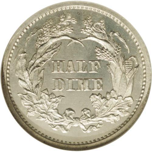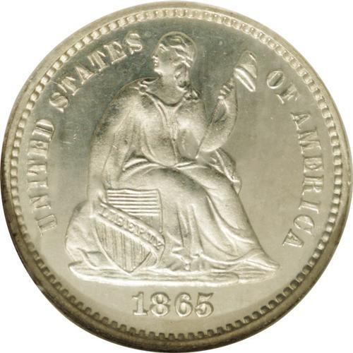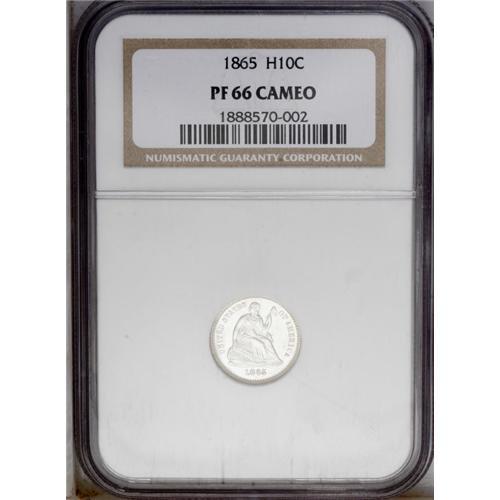 <B>1865<H10C> PR66 Cameo NGC.</B></I> An intricately struck and nearly brilliant premium Gem with clean surfaces. The reverse is lightly die doubled, most evident on the H in HALF, and the obverse has a prominent wire rim between 5 and 9 o'clock. A pinpoint spot on the center of the M in DIME will identify this piece in future appearances. Only 500 proofs were struck, and the associated commercial mintage of 13,000 pieces is also low. Census: 5 in 66 Cameo, 0 finer (1/06).
