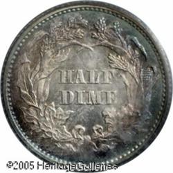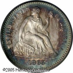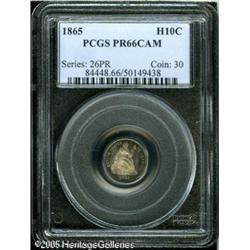 <B>1865 H10C PR66 Cameo PCGS.</B></I> Appreciable contrast is seen against a backdrop of russet and turquoise peripheral toning. Proofs from this year enjoy added popularity due to their proximity to the Civil War and low total production for the year of just 13,500 pieces. This two-toned specimen ranks among the finer survivors of 500 proofs struck. Population: 3 in 66 Cameo, 1 finer (1/05). Lot:6167