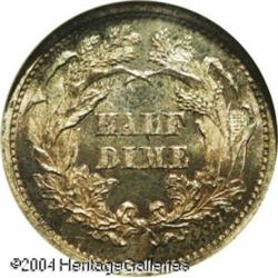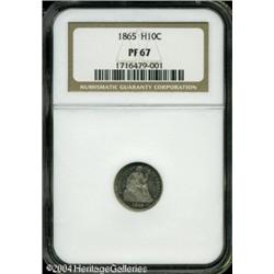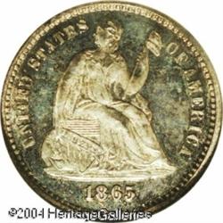 1865 H10C PR67 NGC. The 1865 is among the rarest d <B>1865 H10C PR67 NGC.</B></I> The 1865 is among the rarest dates in the series. Only 13,000 business strikes were issued, in addition to 500 proofs. Only one die marriage is known (V-1) and it was used for both finishes. The 1 in the date is lightly recut near the base, and the H in HALF and D in DIME are lightly die doubled. This splendid Gem proof has intermingled gray, rose, and blue hues. Well struck and lovingly preserved. A lintmark is visible below the 8 in the date, and serves as a pedigree. Population: 4 in 67, 1 finer (11/04). <BR><BR><B>Important notice:</B> Heritage usually auctions material at the rate of 200-250 lots per hour. On some occasions eBay Live bid software or the Internet may not be able to keep up with the pace of the auction. We recommend placing a realistic absentee bid now as insurance to avoid disappointment. Occasionally the auctioneer may eliminate or reject an eBay Live bid, and the auctioneer may also reopen a lot after the close of the eBay live bidding (usually because we missed an audience bid), and may reject your bid even if it shows you as the winning bidder. By bidding via eBay Live, you agree that Heritage may award the lot to another bidder at its sole discretion under the circumstances described above or any other reasonable circumstances. Since eBay bids are not shown to us until we open the lot on the floor, we treat those bids just like floor bids. In most cases the floor responds before the eBay bid is presented to us, due to Internet lag time, so for consistency we have made it a policy that floor bids are always considered first over tie eBay live bids. Also please note that all Heritage lots purchased through eBay Live carry a 20% Buyer's Premium. Please make sure you read the Terms and Conditions before you bid. This lot is being auctioned in conjunction with a live floor auction by Heritage Galleries & Auctioneers. All final auction and invoice information will be supplied by Heritage Galleries & Auctioneers, and all other information should be considered preliminary. Lot:5693