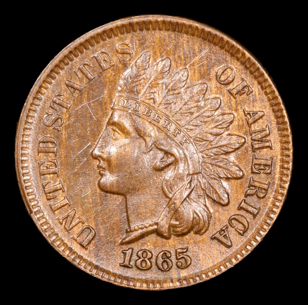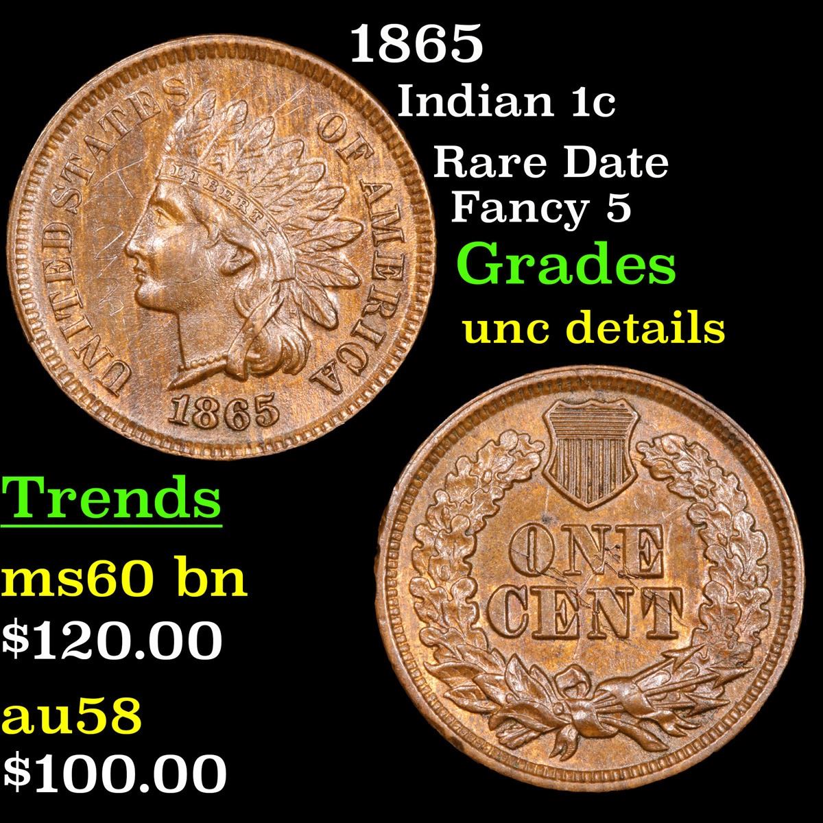 1865 Rare Date Fancy 5 Indian Cent 1c Grades Unc Details.