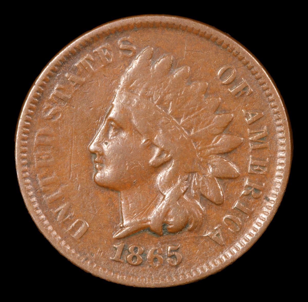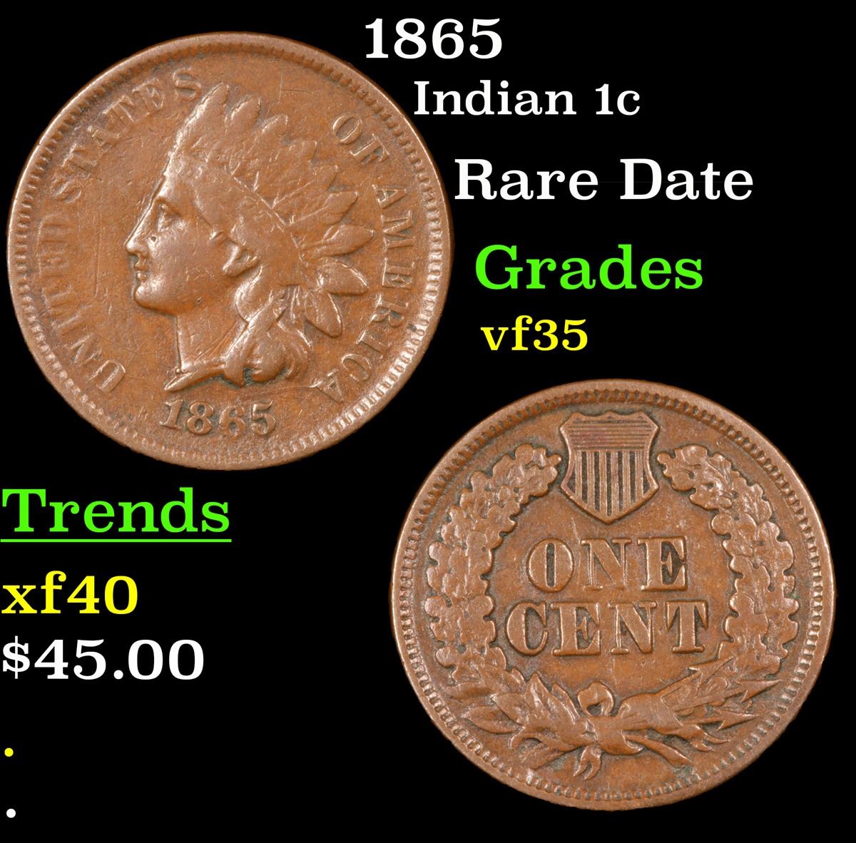 1865 Rare Date . Indian Cent 1c Grades vf++.