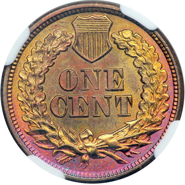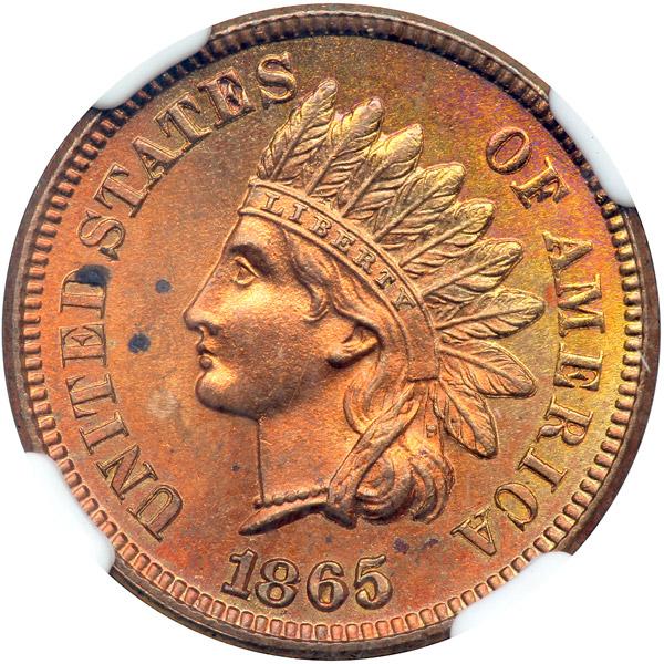 1865 Indian Head Cent. NGC graded Details of Uncirculated altered color. Possibly cleaned half a century ago, now appears quite natural. We note some obverse spots. We suggest you look on our web site (www.goldbergcoins.com) for the very attractive toning.