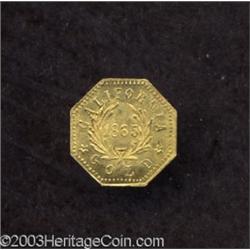 <table><tr><td><TABLE cellSpacing=0 cellPadding=0 width="100%" bgColor=#000000 border=0><TBODY> <TR><TD width="100%"><TABLE cellSpacing=1 cellPadding=3 width="100%" border=0><TBODY><TR><TD width="100%" bgColor=#79735c><FONT face=arial color=#ffffff size=3><B>Description</B> </FONT></TD></TR><TR><TD width="100%" bgColor=#ffffff><FONT face=arial size=2><B>"1865" Liberty Head Octagonal California Gold Token MS64 Uncertified.</B></I><BR><I>From The New Millennium Collection.</B></I> </FONT></TD></TR></TBODY></TABLE></TD></TR></TBODY></TABLE><BR><A name=PricesRealized></A><TABLE cellSpacing=0 cellPadding=0 width="100%" bgColor=#000000 border=0><TBODY><TR><TD width="100%"><TABLE cellSpacing=1 cellPadding=3 width="100%" border=0><TBODY><TR><TD width="100%" bgColor=#79735c><A name=PR><FONT face=arial color=#ffffff size=3><B>Previous Prices from Heritage Auctions</B> </FONT></A></TD></TR><TR><TD bgColor=#f6f6ed>No Prior Data Recorded </TD></TR><TR><TD bgColor=#ffffff><FONT face=arial size=1 ?>PLEASE NOTE: All prices realized reflect the final hammer price PLUS the buyer's premium in auctions that charge a buyer's premium. Each item has a notation at the top of the listing indicating whether that lot included a buyer's premium. Example: A item that sells with a final hammer price of $100 and a 20% buyer's premium will display with a price realized of $120. All information listed is intended to be as accurate as possible, but errors are possible. Please use this guide carefully and inform us of any inaccuracies. </FONT></TD></TR></TBODY></TABLE></TD></TR></TBODY></TABLE><BR><TABLE cellSpacing=0 cellPadding=0 width="100%" bgColor=#000000 border=0><TBODY><TR><TD width="100%"><TABLE cellSpacing=1 cellPadding=3 width="100%" border=0><TBODY><TR><TD width="100%" bgColor=#79735c colSpan=6><FONT face=arial color=#ffffff size=3><B>Price Guide*</B> </FONT></TD></TR><TR bgColor=#f6f6ed><TD align=middle><B>Grade</B> </TD><TD align=middle><B>Coin World<BR>(Trends)</B> </TD><TD align=middle><B>Numismedia<BR>Retail</B> </TD><TD align=middle><B>Numismedia<BR>Wholesale</B> </TD><TD align=middle><B>Coin<BR>Universe</B> </TD><TD align=middle><B>Heritage<BR>Value Index</B> </TD></TR><TR bgColor=#ffffff><TD align=middle>63</TD><TD align=right>---</TD><TD align=right>---</TD><TD align=right>---</TD><TD align=right>---</TD><TD align=right>---</TD></TR><TR style="FONT-WEIGHT: bold" bgColor=#cccfdd><TD align=middle>64</TD><TD align=right>---</TD><TD align=right>---</TD><TD align=right>---</TD><TD align=right>---</TD><TD align=right>---</TD></TR><TR bgColor=#ffffff><TD align=middle>65</TD><TD align=right>---</TD><TD align=right>---</TD><TD align=right>---</TD><TD align=right>---</TD><TD align=right>---</TD></TR><TR bgColor=#ffffff><TD colSpan=6><FONT size=1>*All information listed is intended to be as accurate as possible, but errors are possible. No item may be returned or refused based on this information which is provided as a service to our customers. You should contact each pricing source directly to determine the accuracy of this information. </FONT></TD></TR></TBODY></TABLE></TD></TR></TBODY></TABLE><BR><TABLE cellSpacing=0 cellPadding=0 width="100%" bgColor=#000000 border=0><TBODY><TR><TD width="100%"><TABLE cellSpacing=1 cellPadding=3 width="100%" border=0><TBODY><TR><TD width="100%" bgColor=#79735c><FONT face=arial color=#ffffff size=3><B>Population Guide</B> </FONT></TD></TR><TR bgColor=#ffffff><TD align=middle></TD></TR></TBODY></TABLE></TD></TR></TBODY></TABLE><BR><TABLE cellSpacing=0 cellPadding=0 width="100%" bgColor=#000000 border=0><TBODY><TR> Important notice: Heritage usually auctions material at the rate of 200-250 lots per hour. On some occasions eBay Live bid software or the Internet may not be able to keep up with the pace of the auction. We recommend placing a realistic absentee bid now as insurance to avoid disappointment. Occasionally the auctioneer may eliminate or reject an eBay Live bid, and the auctioneer may also reopen a lot after the close of the eBay live bidding (usually because we missed an audience bid), and may reject your bid even if it shows you as the winning bidder. By bidding via eBay Live, you agree that Heritage may award the lot to another bidder at its sole discretion under the circumstances described above or any other reasonable circumstances. Also please note that all Heritage lots purchased through eBay Live carry a 20% Buyer's Premium. Please make sure you read the Terms and Conditions before you bid.</TD></TR></TBODY></TABLE></TD></TR></TBODY></TABLE>